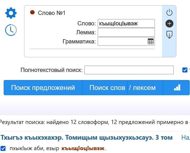 Впрочем, морфологическая сложность слов, а также вариативность в написании требует и более изощренных способов поиска, чем простое задание конкретных форм. Кабардино-черкесский корпус позволяет поиск по словам, содержащим заданные части, то есть некоторые последовательности символов, которые могут представлять собой корни, префиксы, суффиксы и их сочетания. Простейшие инструменты для этого – символы * и ?. Символ * замещает любую последовательность символов (включая пустую, то есть их отсутствие): запрос *къыткIэ* даст примеры со словоформами къыткIэщIодэIухь, зыкъыткIэращIэ и т.д., поскольку во всех них есть последовательность къыткIэ. Символ ? замещает один ненулевой символ. Соответственно, запрос къы?кIэ* покажет среди прочих примеры къыткIэщIодэIухь, къыскIэлъысащ, къыпкIэрех, “вставляя” один символ в последовательности символов къы_кIэ. Специально отметим, что символом является один знак, и буквы-диграфы и триграфы (например, щI, кIу) понимаются как последовательности нескольких символов. Легко также сообразить, что обозначение ?* будет замещать любую ненулевую последовательность символов.