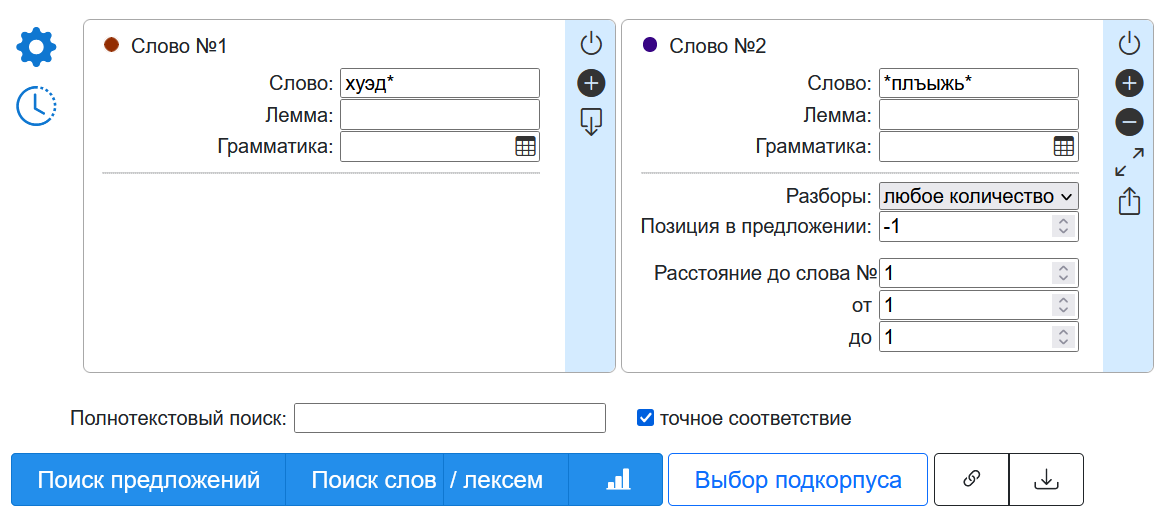 Но корпус позволяет искать не только отдельные слова, но и сочетания слов, в том числе расположенных на расстоянии друг от друга. Для этого в соответствующем разделе нужно указать дистанцию одного слово от другого: например, дистанция от 1 до 1 означает, что речь идёт о следующем слове, дистанция от -1 до -1 – что имеется в виду предыдущее слово, если указывается дистанция 0, подразумевается, что описывается то же слово, что и слово, находящееся от него в нулевой дистанции (это особенно полезно при «отрицательном поиске»; см. ниже). При отсутствии указания на дистанцию между словами производится поиск предложений, в которых присутствуют оба слова. Кроме того, есть возможность указать диапазон положения слова в предложении (здесь положительные числа дают отсчёт с начала предложения, а отрицательные – с конца). Так, на рис. 2 показан запрос, при котором слово, содержащее последовательность символов плъыжь (очевидно, одна из форм слова ‘красный’), занимает последнюю позицию в предложении и ему непосредственно предшествует слово, начинающееся на последовательность символов хуэд.
