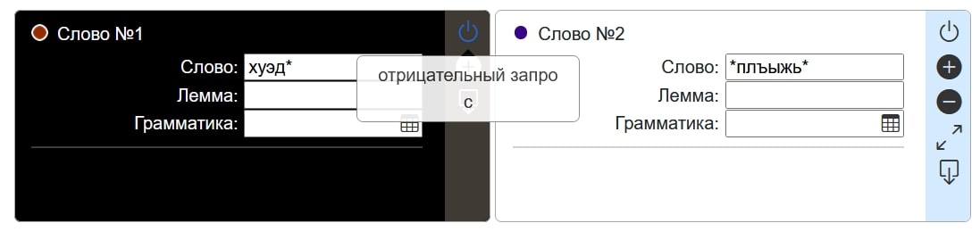 «Отрицательный поиск» - это возможность искать, указывая признаки, которые должны отсутствовать в слове. Для этого при указании на слово необходимо нажать на соответствующий значок (ср. рис. 3, изображающий запрос предложений, содержащих слово с последовательностью символов плъыжь, но не содержащих слова, начинающиеся на хуэд). Для «ненужного» слова, как и для «нужного», можно указать обычным образом точную форму или задать ограничения на последовательность символов. Кроме того, можно ограничить его расположение в предложении – относительно других слов и относительно границ предложения. Если дистанция «ненужного» слова от «нужного» указана как нулевая, возникает возможность указать одновременно, каким характеристикам слово должно соответствовать и каким оно не должно соответствовать.
