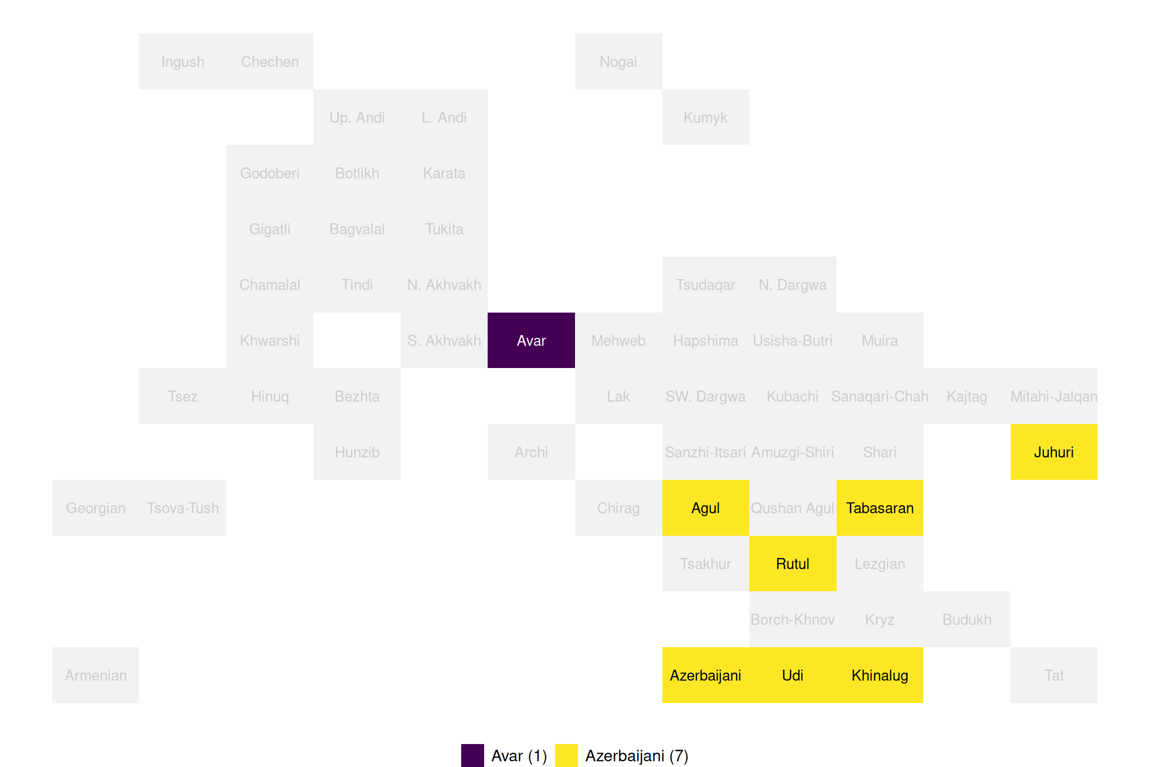 Visualization 1 (General datapoints) shows no more than one dot per language. Visualization 2 (Extrapolated data) represents each language as a cluster of dots, which correspond to villages where a certain language is spoken. Visualization 3 (Data granularity) takes into account dialect levels. Visualization 4 (Tile map) is analogous to Visualization 1 and displays languages as rectangles that are distributed according to their geographic location. On the Data granularity maps you can see the village and the data type (village data, general language data, etc.) when you click on a dot. Hover over or click on a dot to see the language. By unticking the box “show languages” you can remove the inner dots and visualize the distribution of different values in the area without the distraction of genealogical information.