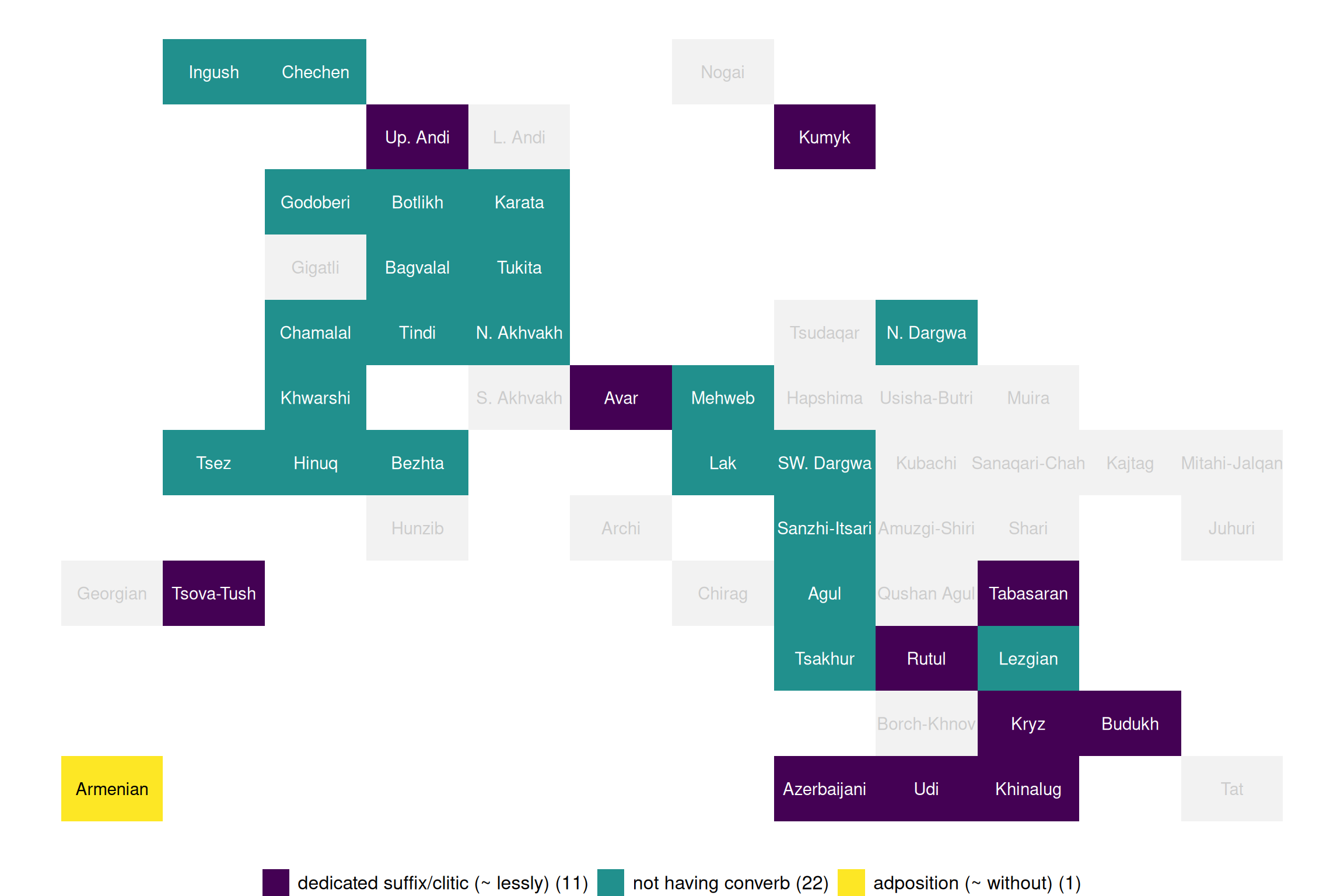 Panova, Anastasia (2021). “Adverbial caritive markers (Maps & Data)”. In: Typological Atlas of the Languages of Daghestan (TALD), v 2.0.1. Ed. by George Moroz, Michael Daniel, Konstantin Filatov, Timur Maisak, Timofey Mukhin, Irina Politova, Elena Shvedova, Samira Verhees and Chiara Naccarato. Moscow: Linguistic Convergence Laboratory, HSE University. DOI: 10.5281/zenodo.6807070. https://lingconlab.ru/tald.
