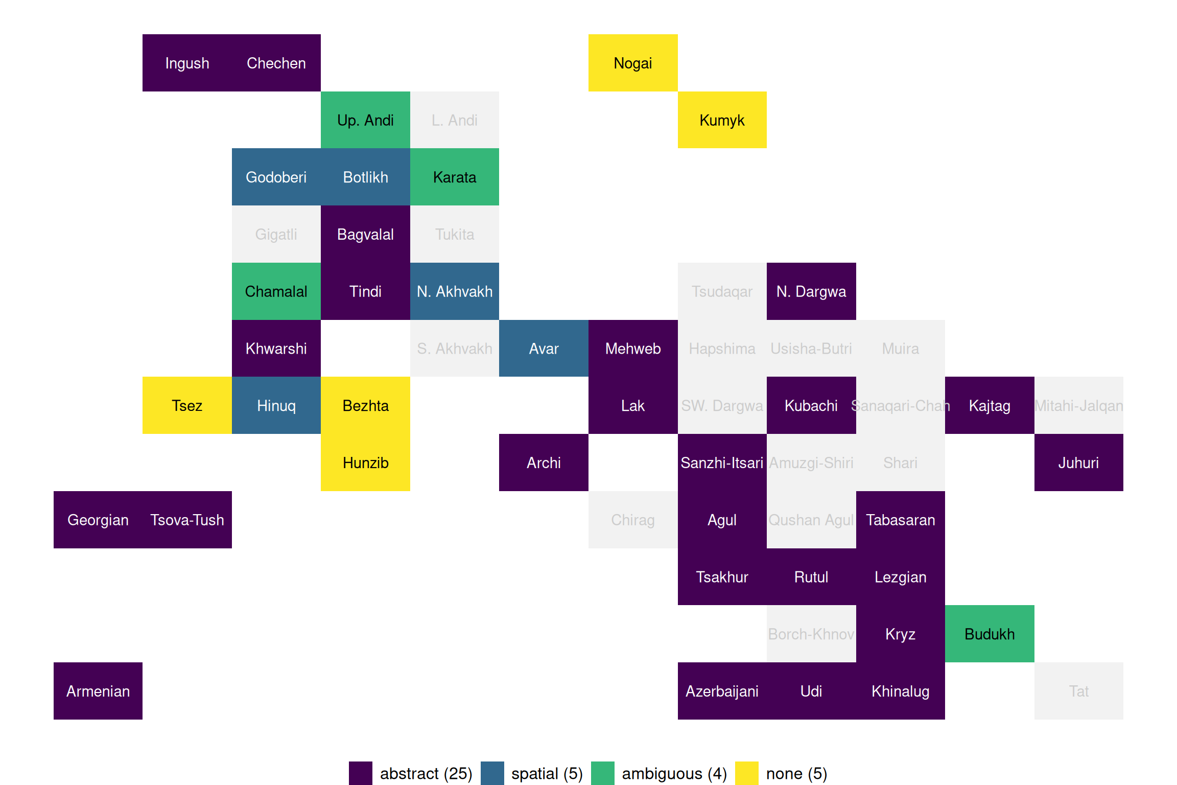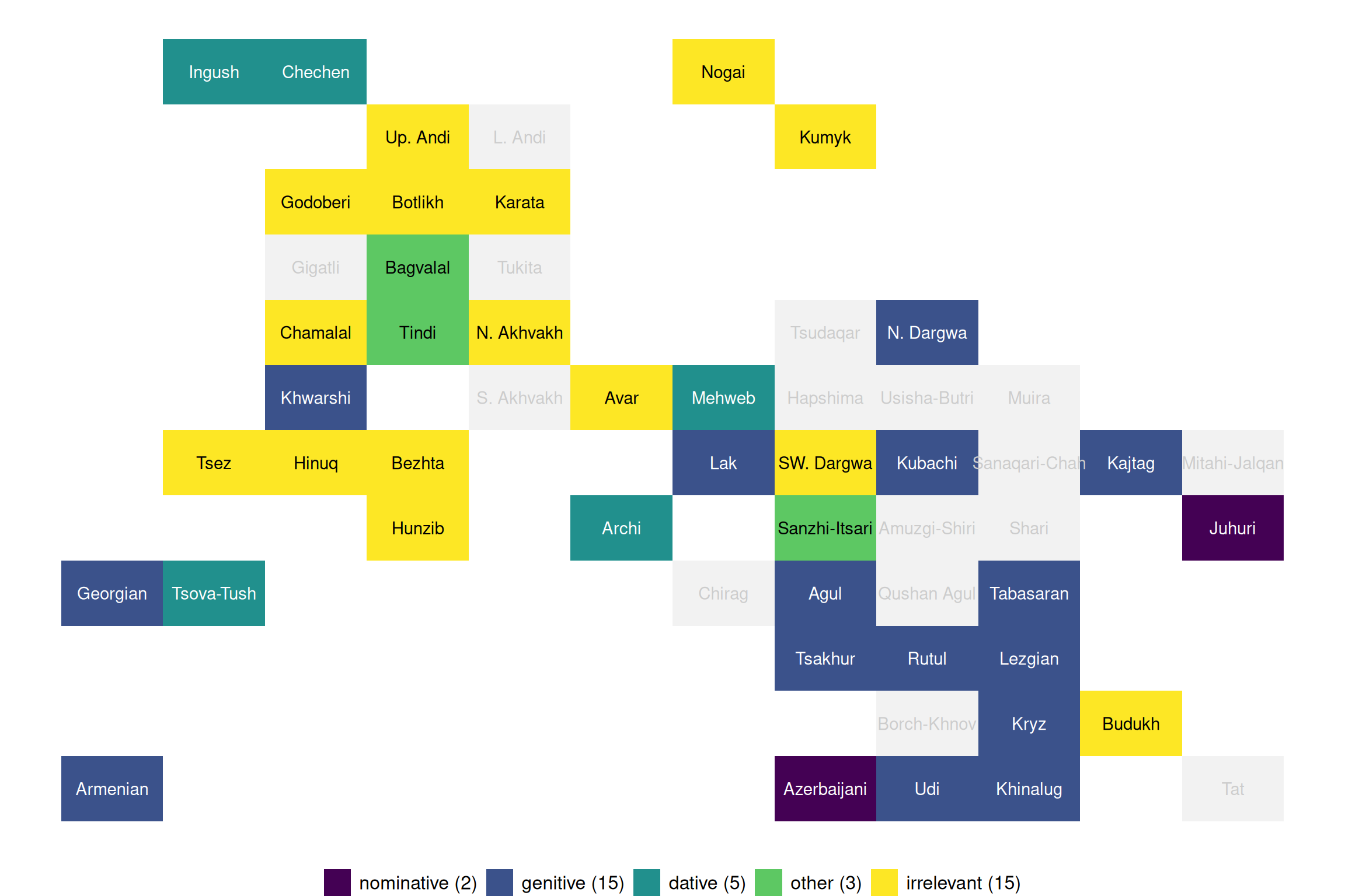 Nasledskova, Polina and Tatiana Philippova (2022). “Dominant adpositional case (Maps & Data)”. In: Typological Atlas of the Languages of Daghestan (TALD), v 2.0.1. Ed. by George Moroz, Michael Daniel, Konstantin Filatov, Timur Maisak, Timofey Mukhin, Irina Politova, Elena Shvedova, Samira Verhees and Chiara Naccarato. Moscow: Linguistic Convergence Laboratory, HSE University. DOI: 10.5281/zenodo.6807070. https://lingconlab.ru/tald.