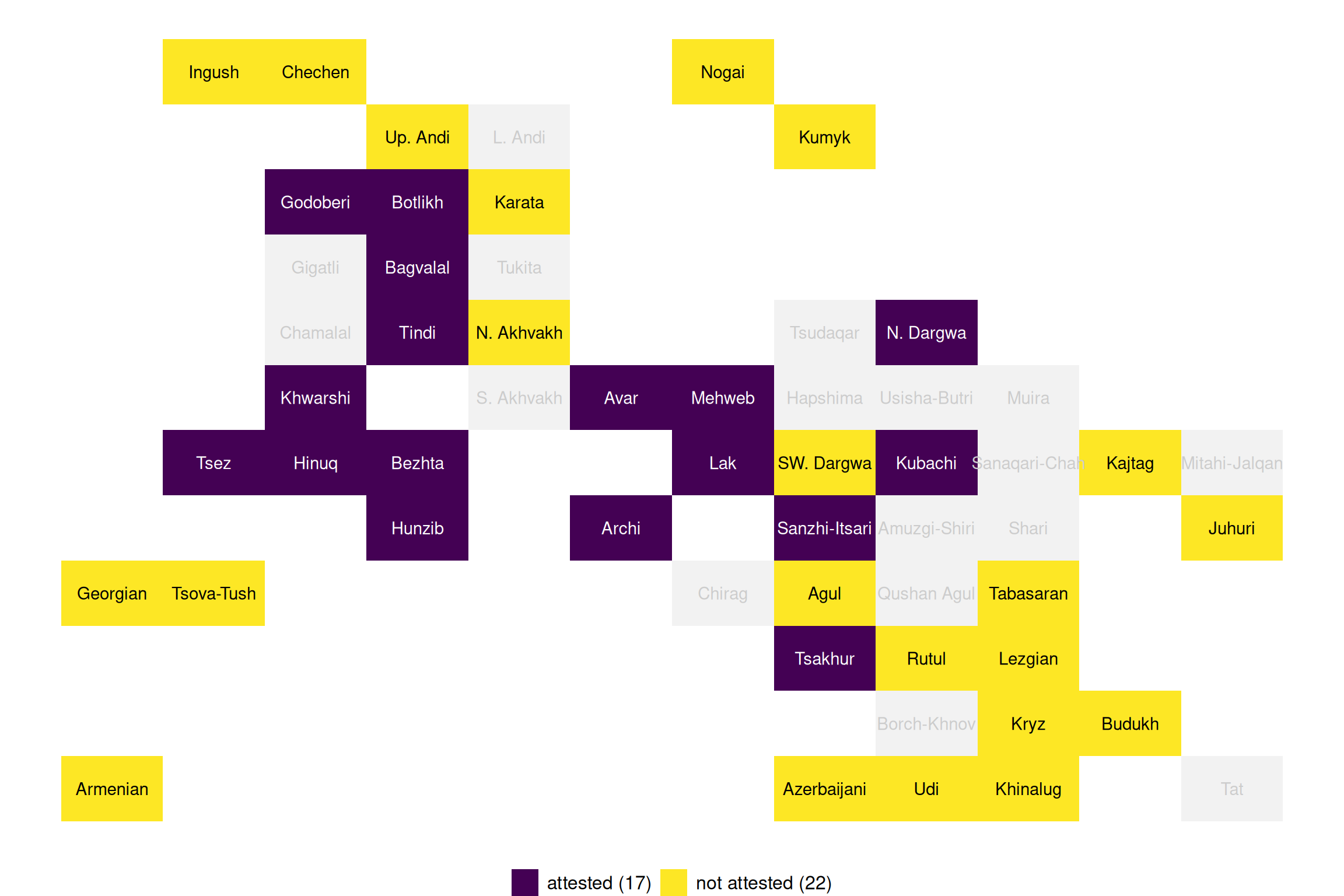 Nasledskova, Polina and Tatiana Philippova (2022). “Agreement of adpositions with the absolutive/nominative argument (Maps & Data)”. In: Typological Atlas of the Languages of Daghestan (TALD), v 2.0.1. Ed. by George Moroz, Michael Daniel, Konstantin Filatov, Timur Maisak, Timofey Mukhin, Irina Politova, Elena Shvedova, Samira Verhees and Chiara Naccarato. Moscow: Linguistic Convergence Laboratory, HSE University. DOI: 10.5281/zenodo.6807070. https://lingconlab.ru/tald.