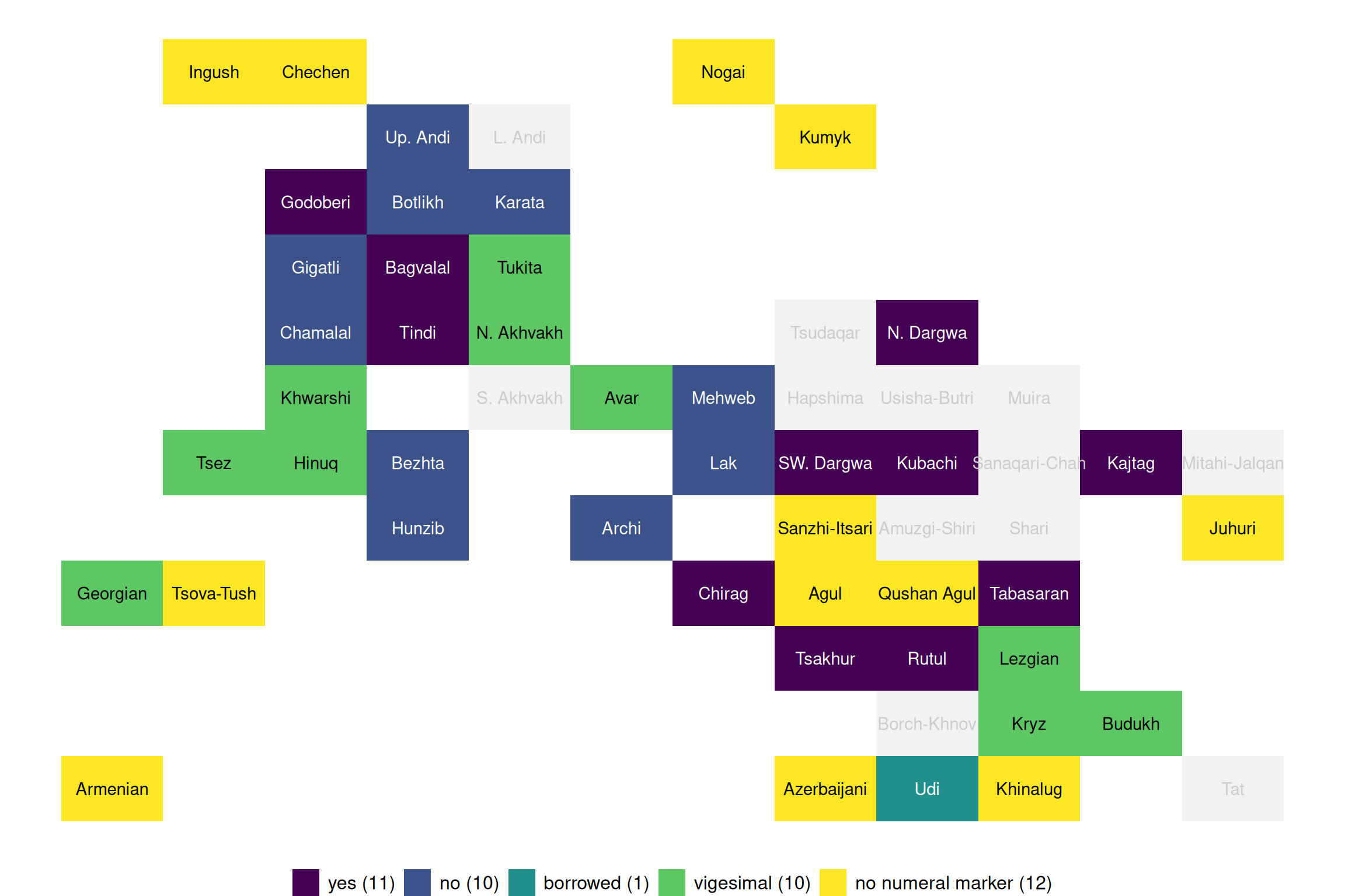 Melenchenko, Maksim (2022). “Special endings for crowns from 30 to 90 (Maps & Data)”. In: Typological Atlas of the Languages of Daghestan (TALD), v 2.0.1. Ed. by George Moroz, Michael Daniel, Konstantin Filatov, Timur Maisak, Timofey Mukhin, Irina Politova, Elena Shvedova, Samira Verhees and Chiara Naccarato. Moscow: Linguistic Convergence Laboratory, HSE University. DOI: 10.5281/zenodo.6807070. https://lingconlab.ru/tald.