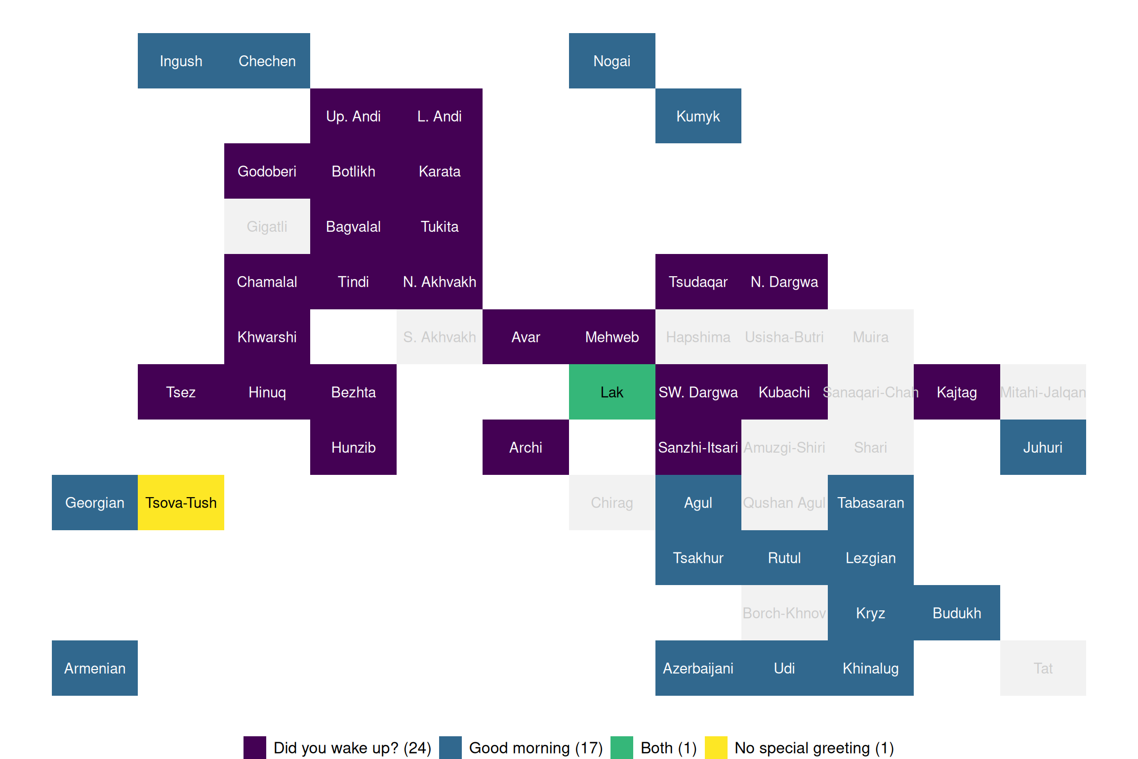 This visualization is analogous to the General datapoints visualization but displays languages as rectangles and allows for color-coding based on specific linguistic values. The Tile map visualization was designed specifically for TALD with the R package RCaucTile (Moroz 2025).